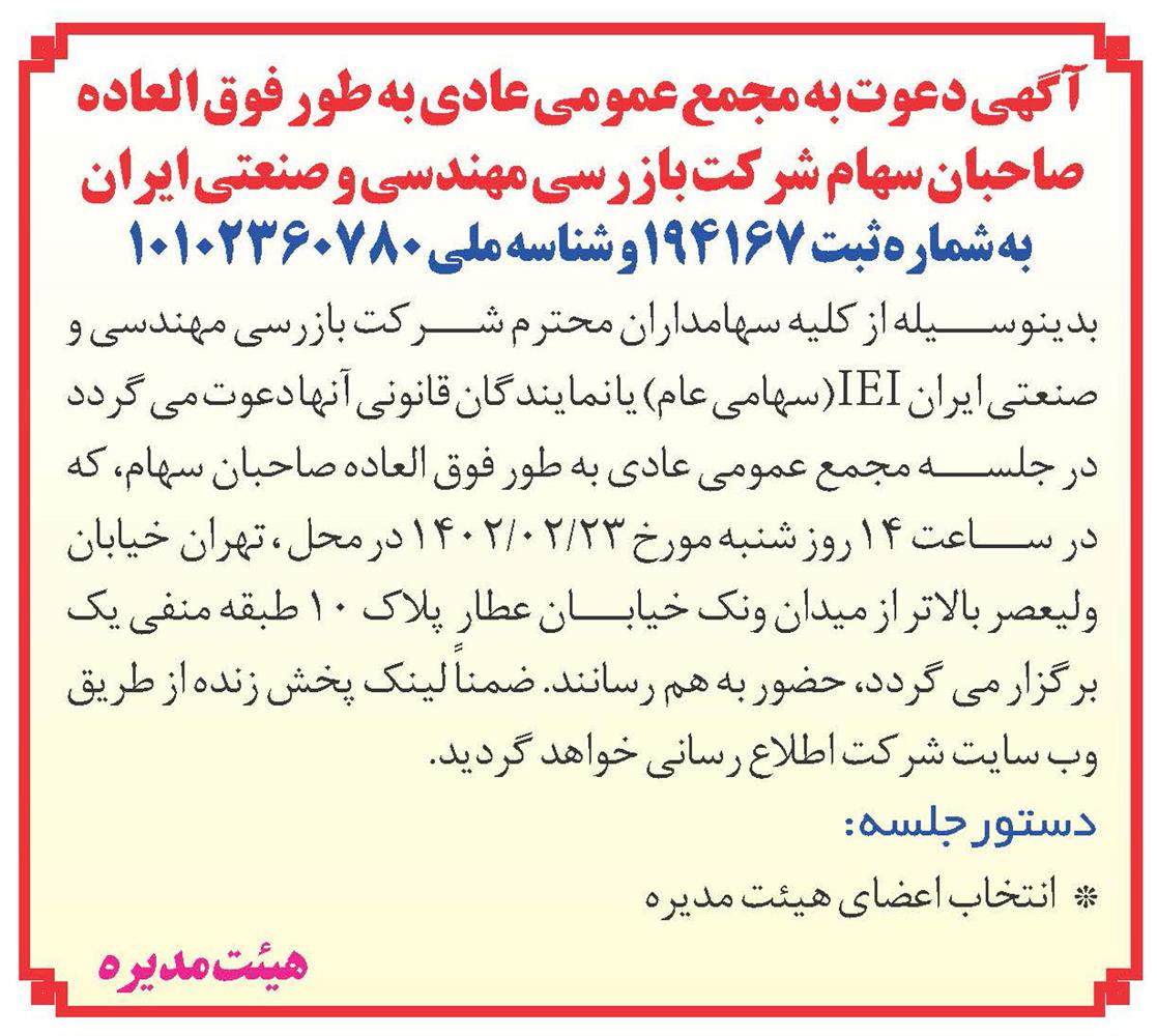 بدينوسيله از كليه سهامداران محترم ، وکیل یا نماینده قانونی صاحب سهم شرکت بازرسی مهندسی و صنعتی ایران IEI (سهامی عام ) دعوت مي شود  تا در جلسه مجمع عمومي عادی به طور فوق العاده صاحبان سهام  كه راس ساعت  14:00  روز شنبه مورخ 1402/03/20  در محل تهران، خیابان ولیعصر بالاتر از ونک خیابان عطار، پلاک10، طبق منفی یک تشکیل می گردد ، حضور بهم رسانند .