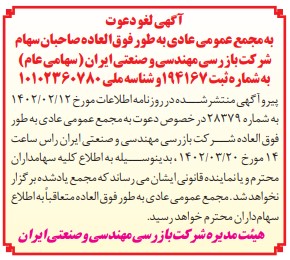 لغو آگهی (اطلاعیه) دعوت به مجمع عمومی عادی بطور فوق العاده برای سال (دوره) مالی منتهی به 1402/06/31
