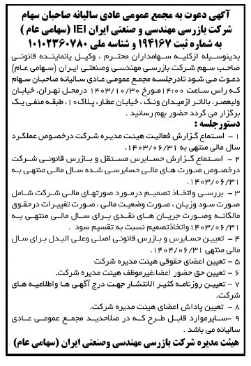 دعوت به مجمع عمومی عادی سالیانه صاحبان سهام شرکت بازرسی مهندسی و صنعتی ایران(سهامی عام) IEI منتهی به 31 شهریور 1403 به شماره ثبت 194167 و شناسه ملی 10102360780