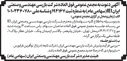 دعوت به مجمع عمومی فوق العاده شركت بازرسى مهندسى و صنعتى ایران IEI مورخ 1404/03/27